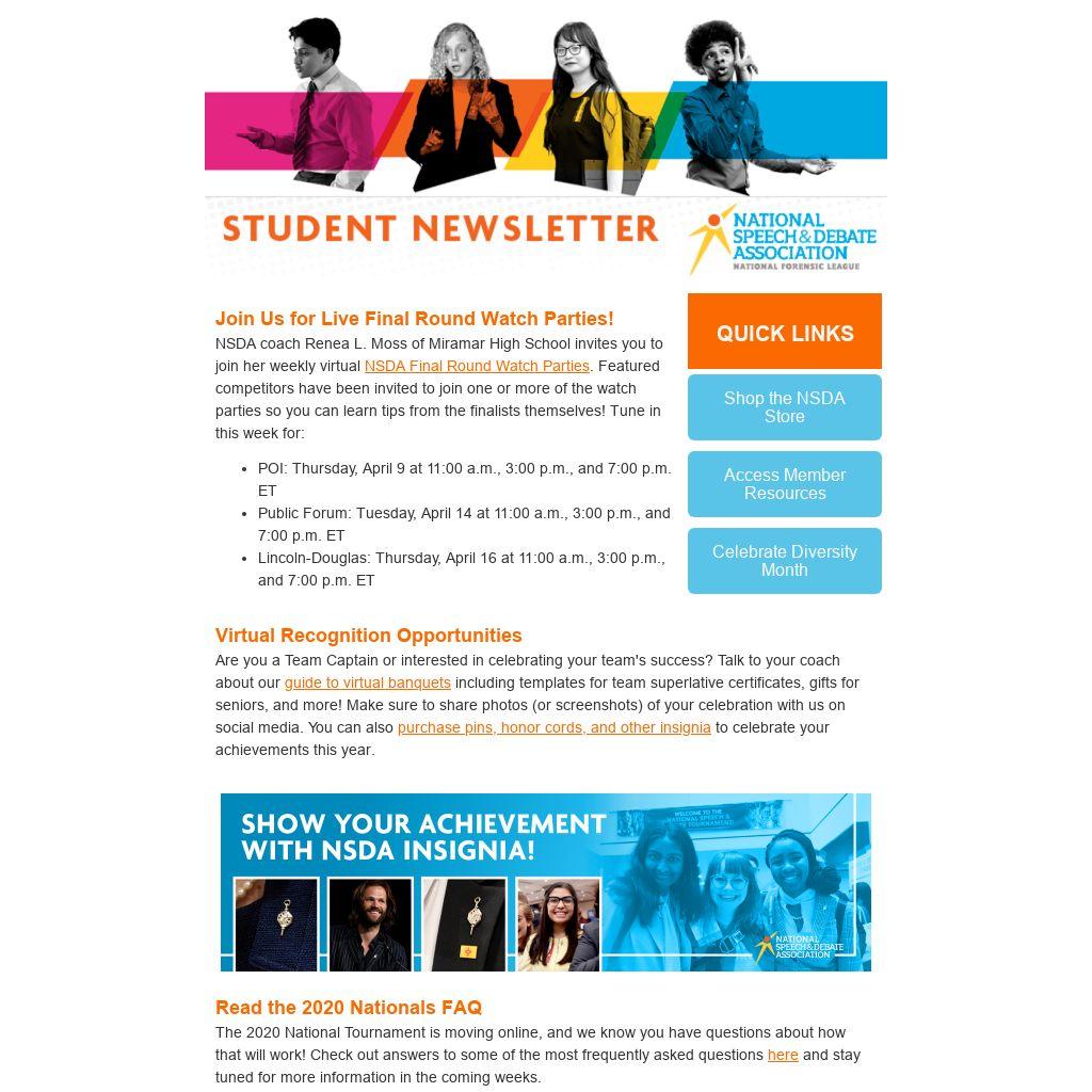 Join Us for Live Final Round Watch Parties! NSDA coach Renea L. Moss of Miramar High School invites you to join her weekly virtual NSDA Final Round Watch Parties. Featured competitors have been invited to join one or more of the watch parties so you can learn tips from the finalists themselves! Tune in this week for: