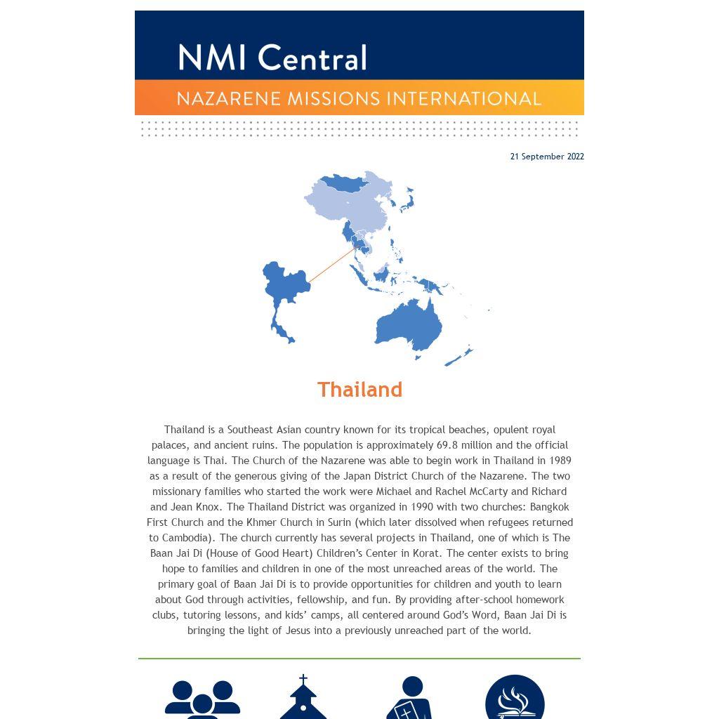 Thailand is a Southeast Asian country known for its tropical beaches, opulent royal palaces, and ancient ruins. The population is approximately 69.8 million and the official language is Thai. The Church of the Nazarene was able to begin work in Thailand in 1989 as a result of the generous giving of the Japan District Church of the Nazarene. The two missionary families who started the work were Michael and Rachel McCarty and Richard and Jean Knox. The Thailand District was organized in 1990 with two churches: Bangkok First Church and the Khmer Church in Surin (which later dissolved when refugees returned to Cambodia). The church currently has several projects in Thailand, one of which is The Baan Jai Di (House of Good Heart) Children’s Center in Korat. The center exists to bring hope to families and children in one of the most unreached areas of the world. The primary goal of Baan Jai Di is to provide opportunities for children and youth to learn about God through activities, fellowship, and fun. By providing after-school homework clubs, tutoring lessons, and kids’ camps, all centered around God’s Word, Baan Jai Di is bringing the light of Jesus into a previously unreached part of the world.