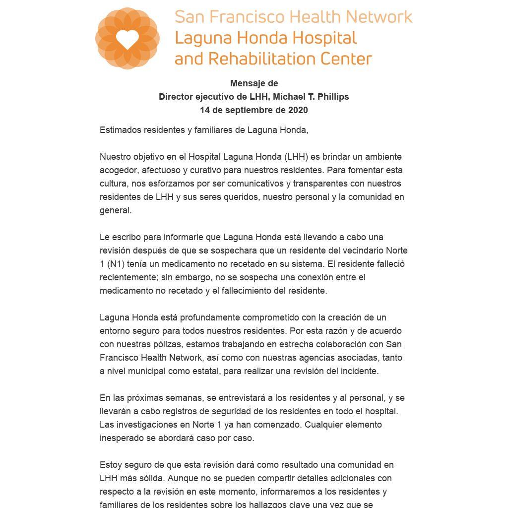Laguna Honda está profundamente comprometido con la creación de un entorno seguro para todos nuestros residentes. Por esta razón y de acuerdo con nuestras pólizas, estamos trabajando en estrecha colaboración con San Francisco Health Network, así como con nuestras agencias asociadas, tanto a nivel municipal como estatal, para realizar una revisión del incidente.