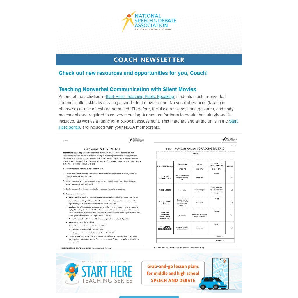 As one of the activities in Start Here: Teaching Public Speaking, students master nonverbal communication skills by creating a short silent movie scene. No vocal utterances (talking or otherwise) or use of text are permitted. Therefore, facial expressions, hand gestures, and body movements are required to convey meaning. A resource for them to create their storyboard is included, as well as a rubric for a 50-point assessment. This material, and all the units in the Start Here series, are included with your NSDA membership.