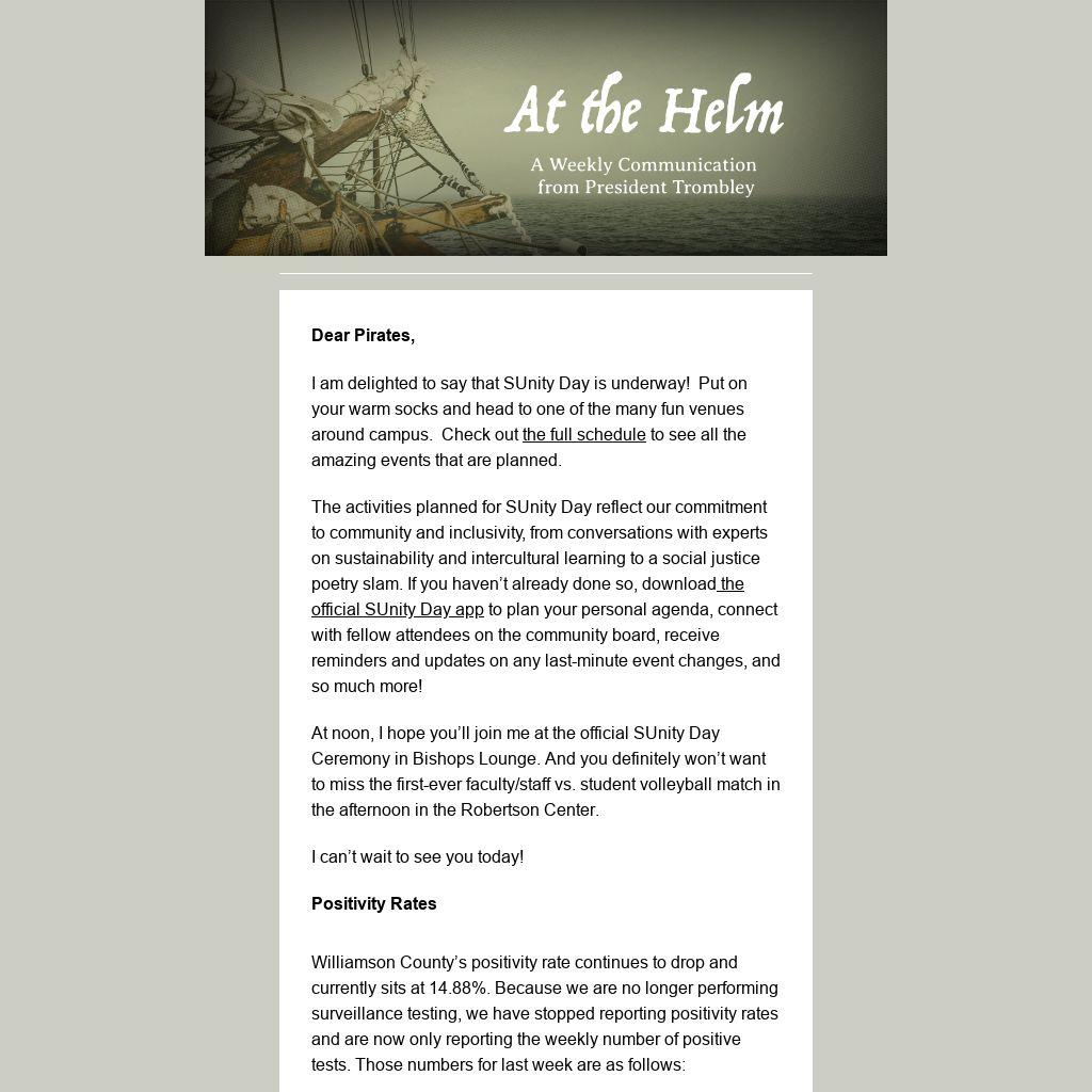 Even with the positivity rate on the decline, we strongly encourage all students, faculty, and staff to get vaccinated, including a booster shot. This remains your best protection against serious illness and hospitalization. We will hold a vaccine clinic on campus on Friday, February 25, from 10 a.m.–2 p.m. in the Howry Center for first, second, and booster doses of the Pfizer and Moderna vaccines.