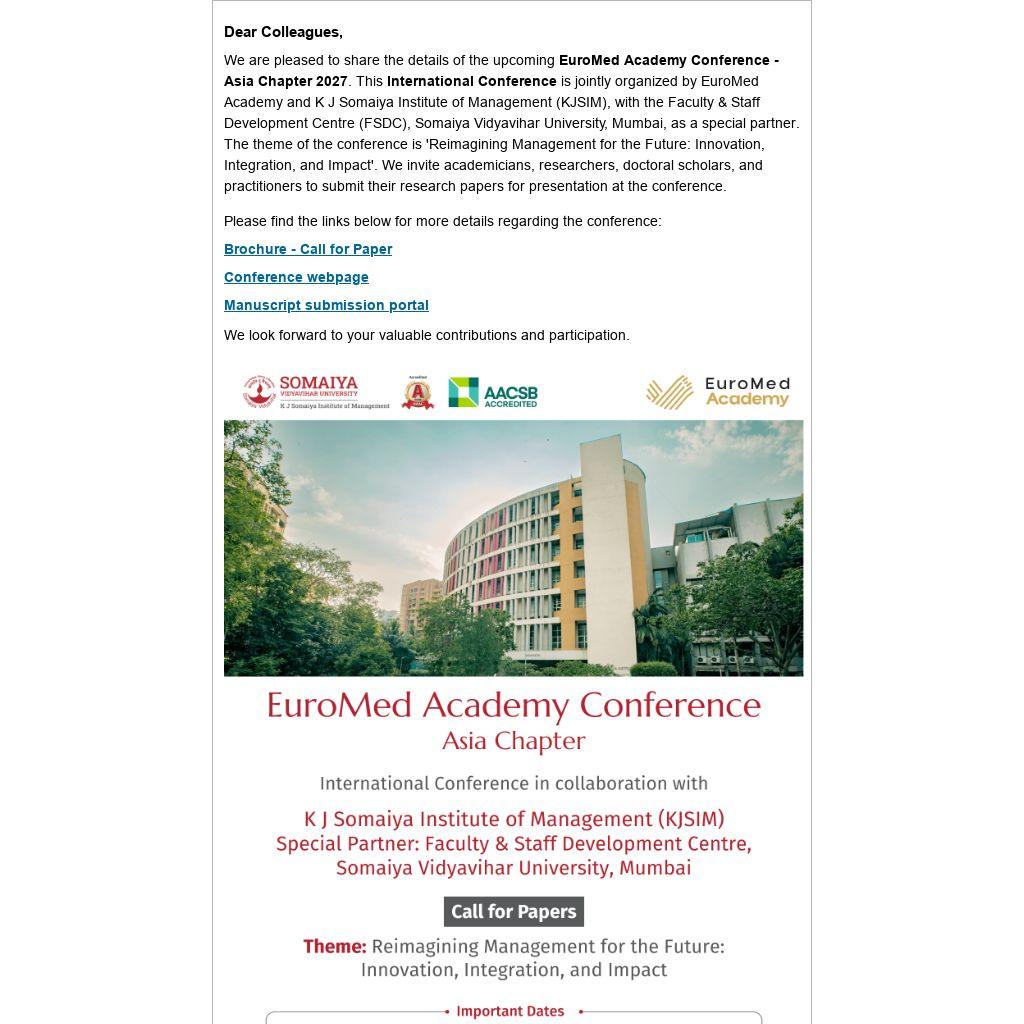We are pleased to share the details of the upcoming EuroMed Academy Conference - Asia Chapter 2027. This International Conference is jointly organized by EuroMed Academy and K J Somaiya Institute of Management (KJSIM), with the Faculty & Staff Development Centre (FSDC), Somaiya Vidyavihar University, Mumbai, as a special partner. The theme of the conference is 'Reimagining Management for the Future: Innovation, Integration, and Impact'. We invite academicians, researchers, doctoral scholars, and practitioners to submit their research papers for presentation at the conference.