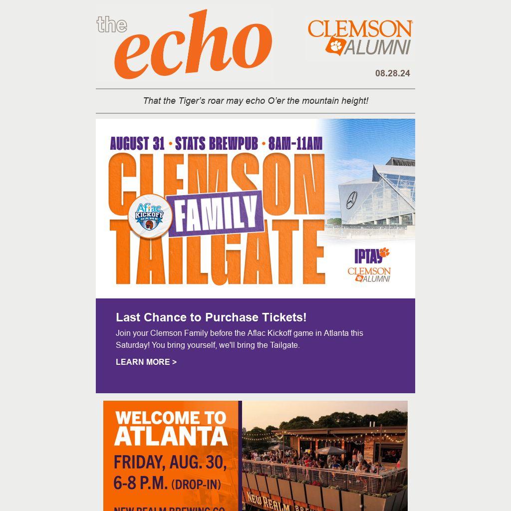 Last Chance to Purchase Tickets! Join your Clemson Family before the Aflac Kickoff game in Atlanta this Saturday! You bring yourself, we'll bring the Tailgate.