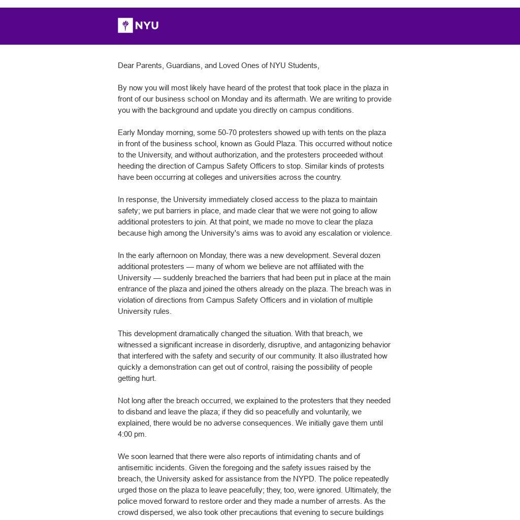 Dear Parents, Guardians, and Loved Ones of NYU Students,