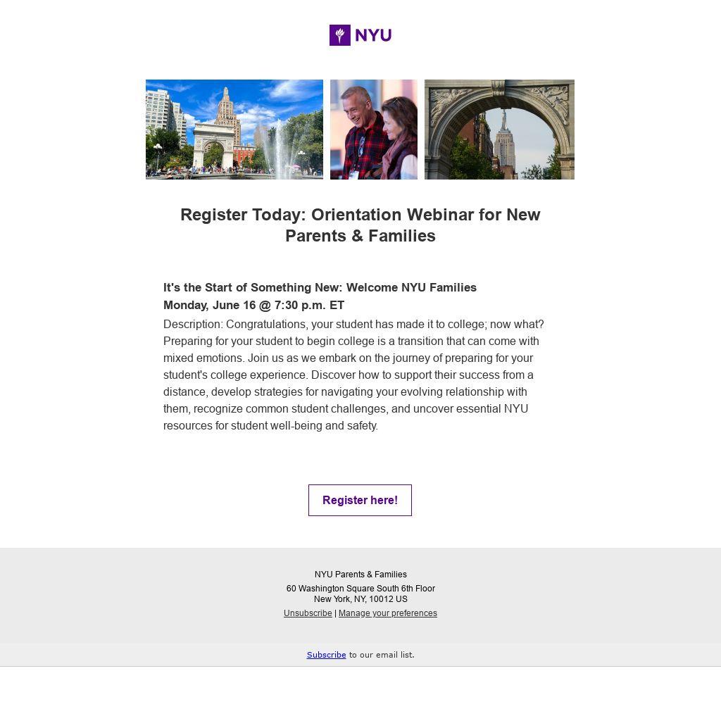 Description: Congratulations, your student has made it to college; now what? Preparing for your student to begin college is a transition that can come with mixed emotions. Join us as we embark on the journey of preparing for your student's college experience. Discover how to support their success from a distance, develop strategies for navigating your evolving relationship with them, recognize common student challenges, and uncover essential NYU resources for student well-being and safety.