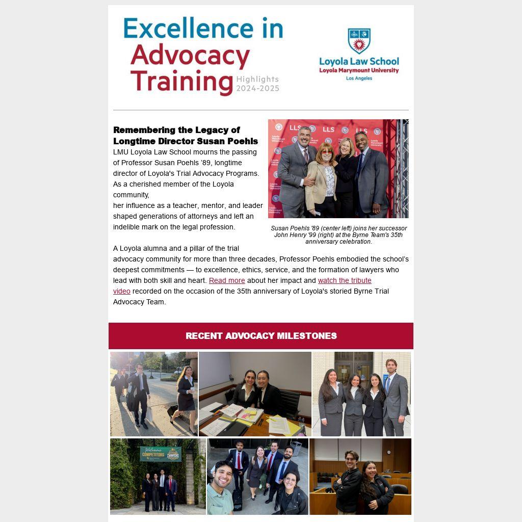 Remembering the Legacy of Longtime Director Susan PoehlsLMU Loyola Law School mourns the passing of Professor Susan Poehls ’89, longtime director of Loyola's Trial Advocacy Programs. As a cherished member of the Loyola community, her influence as a teacher, mentor, and leader shaped generations of attorneys and left an indelible mark on the legal profession.