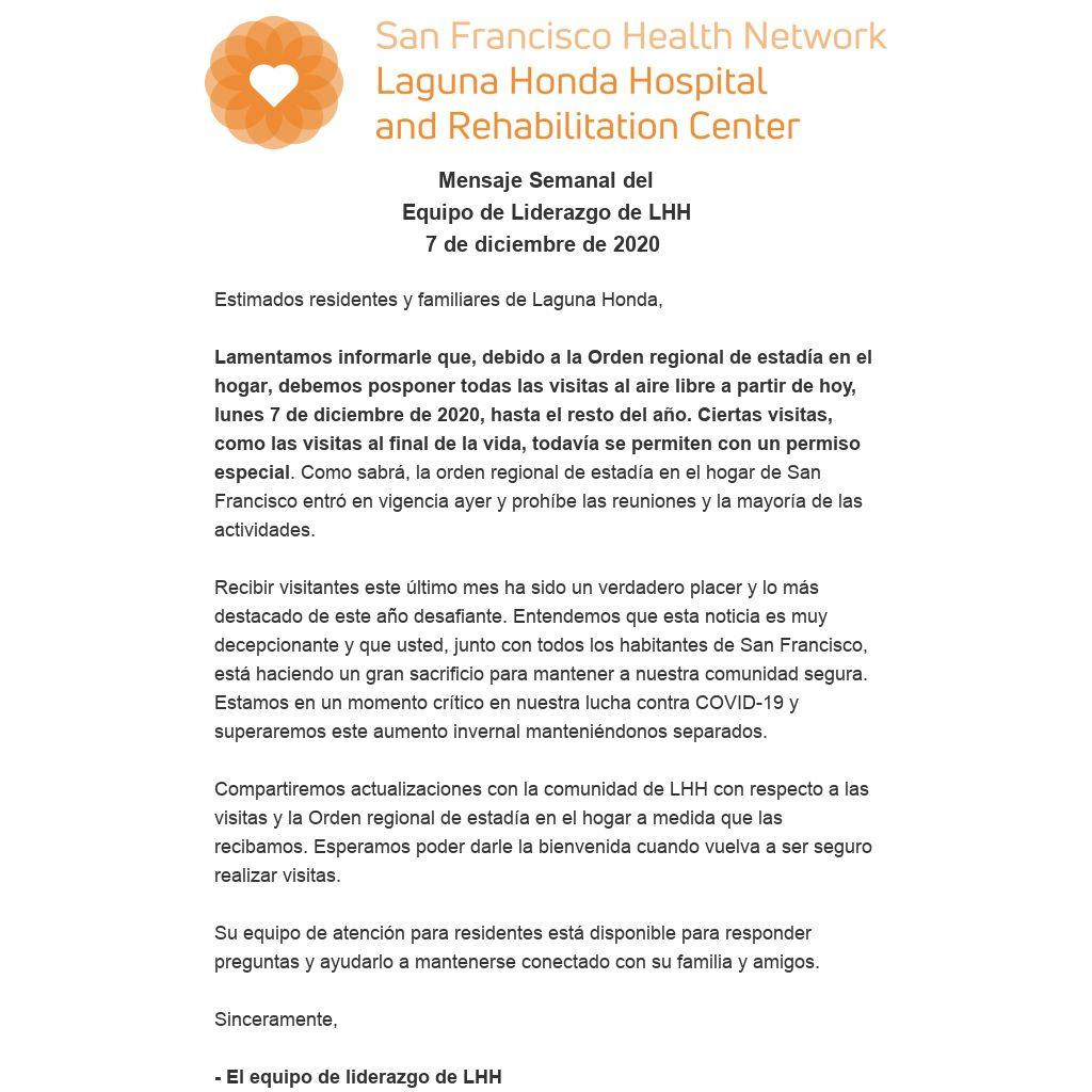 Lamentamos informarle que, debido a la Orden regional de estadía en el hogar, debemos posponer todas las visitas al aire libre a partir de hoy, lunes 7 de diciembre de 2020, hasta el resto del año. Ciertas visitas, como las visitas al final de la vida, todavía se permiten con un permiso especial. Como sabrá, la orden regional de estadía en el hogar de San Francisco entró en vigencia ayer y prohíbe las reuniones y la mayoría de las actividades.