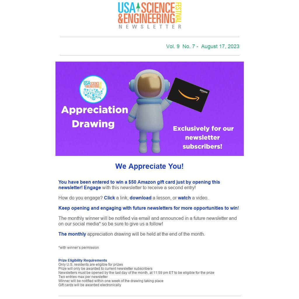 You have been entered to win a $50 Amazon gift card just by opening this newsletter! Engage with this newsletter to receive a second entry!