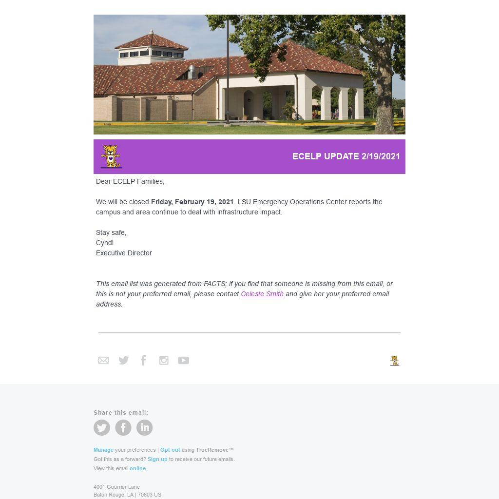 We will be closed Friday, February 19, 2021. LSU Emergency Operations Center reports the campus and area continue to deal with infrastructure impact.