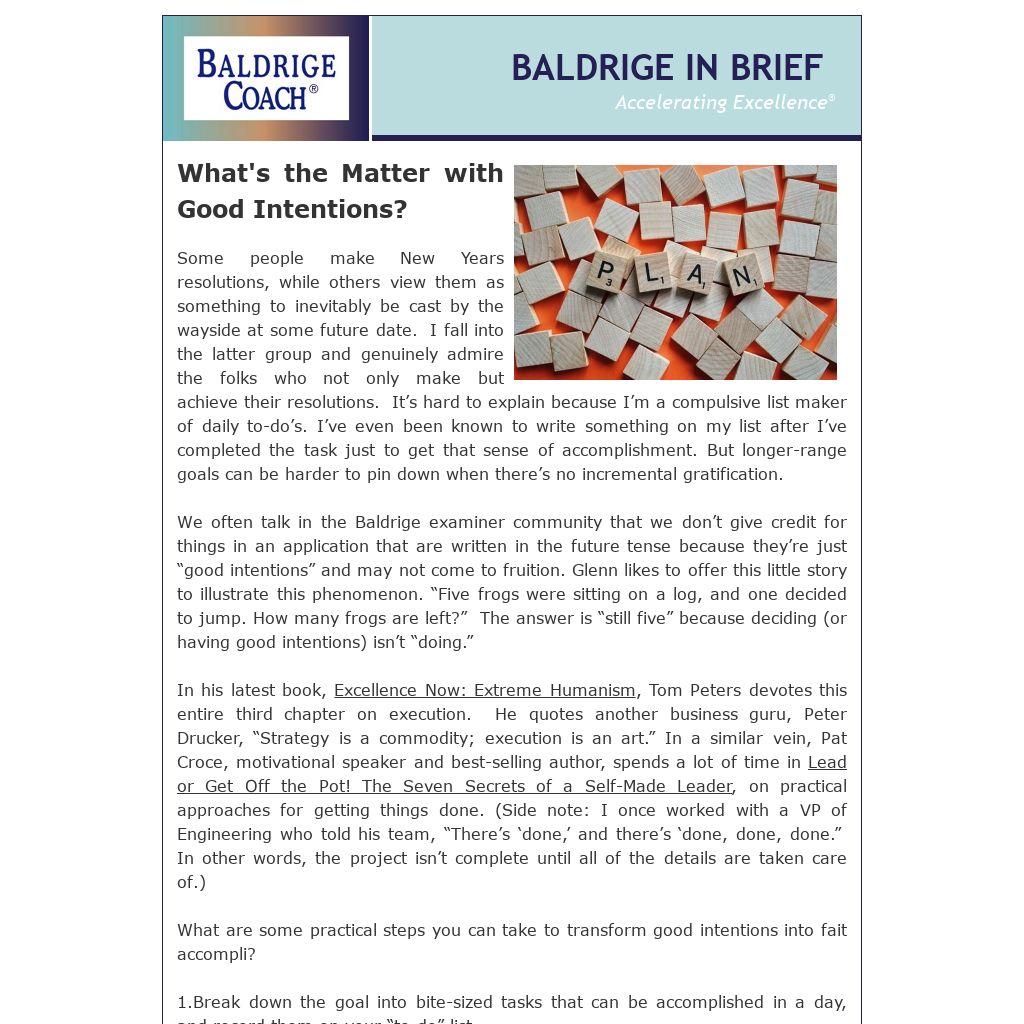 As a leader in your organization, do you make action plans without having a follow-up mechanism to review progress? In your performance management process, how much weight is given to actually achieving an identified goal? Do you require projects to be “done, done, done,” or do you give credit for a good effort? There are two balancing core values and concepts in the Baldrige Excellence Framework: Visionary Leadership and Delivering Value and Results. If you read many of the Baldrige Award Recipient Profiles https://www.nist.gov/baldrige/award-recipients, you’ll find role model practices in many of the process categories of the Criteria but also enviable results the organizations have achieved. Their stories might inspire some of your own efforts to achieve some of your own good intentions.