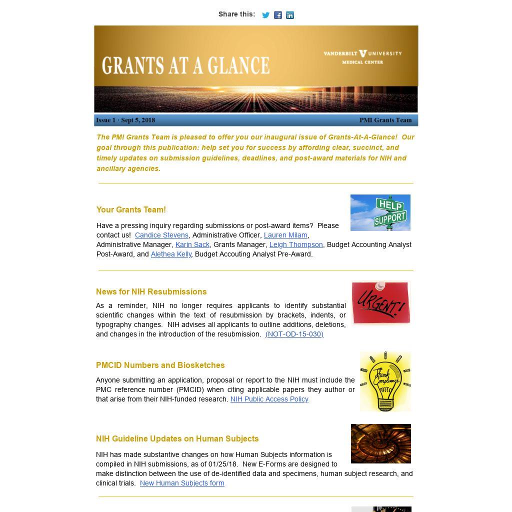 The PMI Grants Team is pleased to offer you our inaugural issue of Grants-At-A-Glance! Our goal through this publication: help set you for success by affording clear, succinct, and timely updates on submission guidelines, deadlines, and post-award materials for NIH and ancillary agencies.