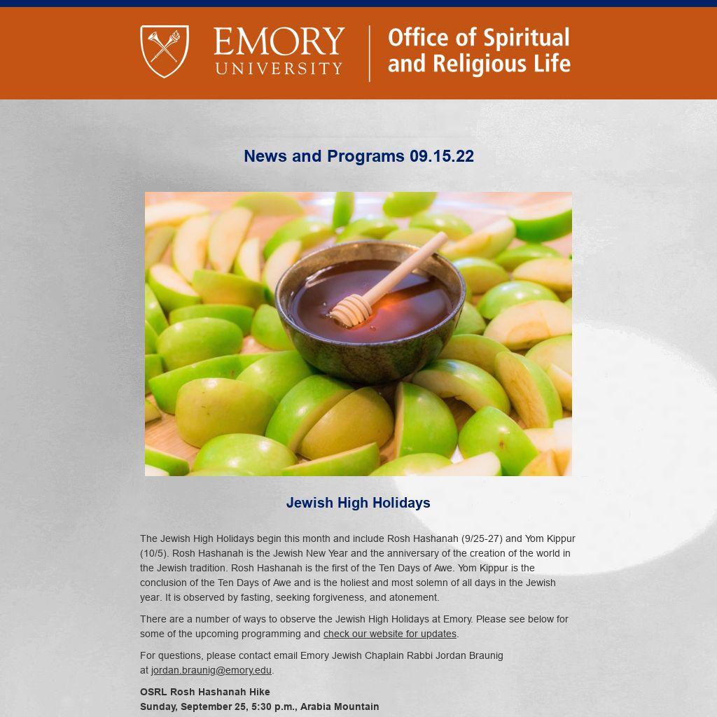 Emory OSRL ENews is published weekly during term by the Emory University Office of Spiritual and Religious Life publicizing Atlanta-campus spiritual life programs. It is not a comprehensive listing. For Oxford College spiritual life, please click here. To submit information or to update your preferences, please contact religiouslife@emory.edu.