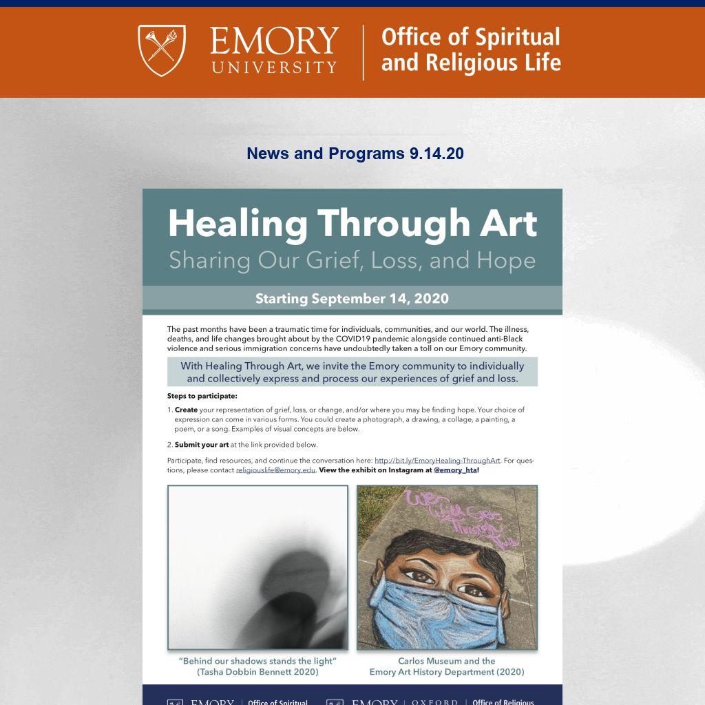 Emory OSRL Enews is published weekly during term by the Emory University Office of Spiritual and Religious Life covering Atlanta-campus programs. For Oxford College spiritual life, please click here. To submit information or to update your preferences, please contact religiouslife@emory.edu.