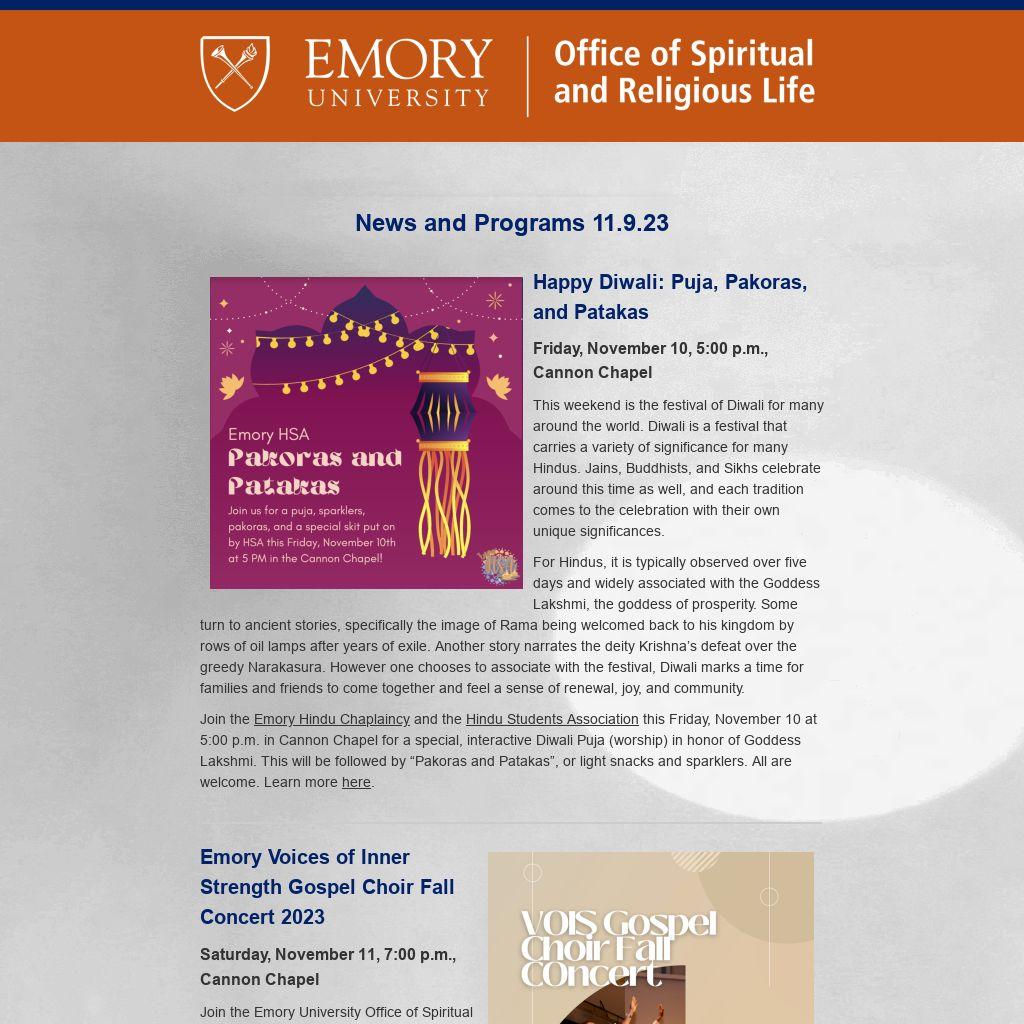 Emory OSRL ENews is published weekly during term by the Emory University Office of Spiritual and Religious Life publicizing Atlanta-campus spiritual life programs. It is not a comprehensive listing. For Oxford College spiritual life, please click here. To submit information or to update your preferences, please contact religiouslife@emory.edu.
