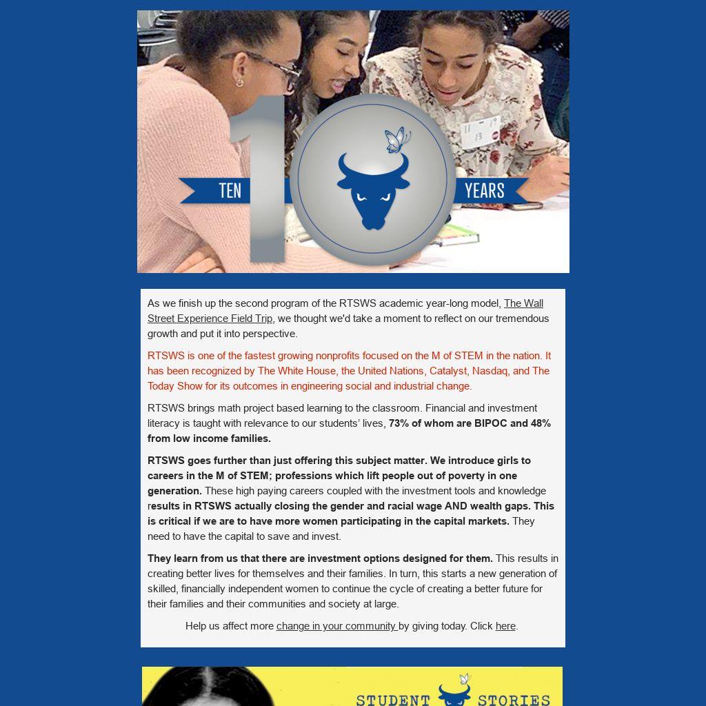 RTSWS is one of the fastest growing nonprofits focused on the M of STEM in the nation. It has been recognized by The White House, the United Nations, Catalyst, Nasdaq, and The Today Show for its outcomes in engineering social and industrial change.