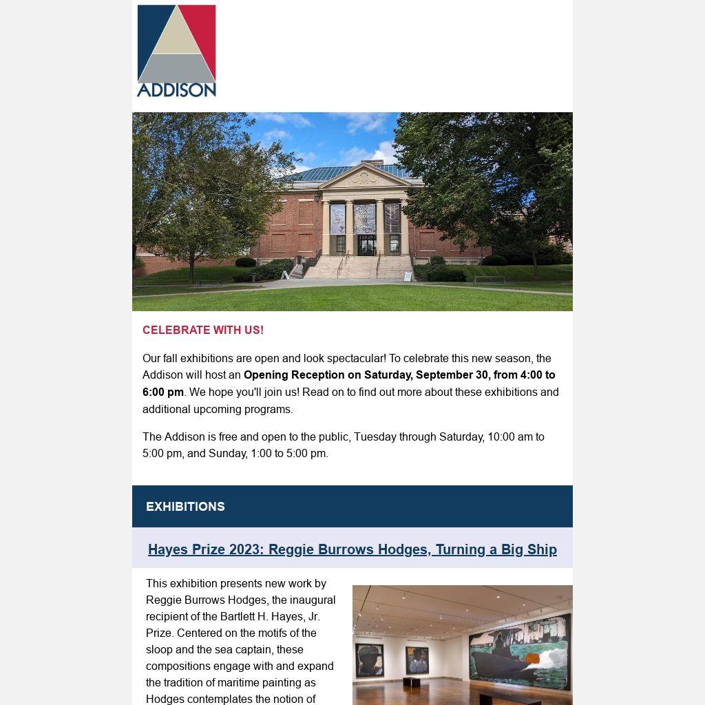 Our fall exhibitions are open and look spectacular! To celebrate this new season, the Addison will host an Opening Reception on Saturday, September 30, from 4:00 to 6:00 pm. We hope you'll join us! Read on to find out more about these exhibitions and additional upcoming programs.