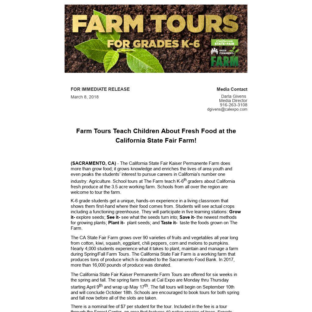 For more information about The California State Fair Kaiser Permanente Farm School Tours and to schedule an interview with a classroom tour, contact: