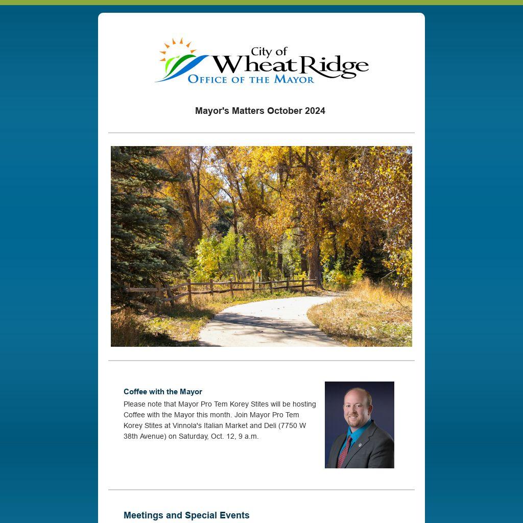 Please note that Mayor Pro Tem Korey Stites will be hosting Coffee with the Mayor this month. Join Mayor Pro Tem Korey Stites at Vinnola's Italian Market and Deli (7750 W 38th Avenue) on Saturday, Oct. 12, 9 a.m.