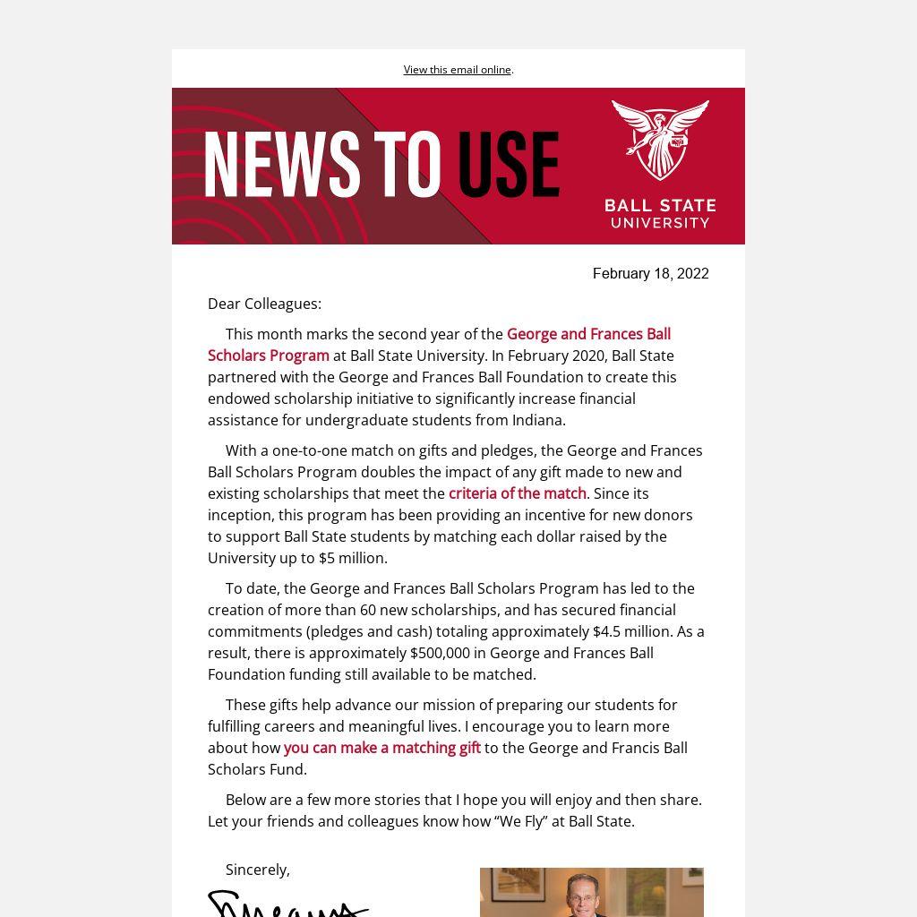 These gifts help advance our mission of preparing our students for fulfilling careers and meaningful lives. I encourage you to learn more about how you can make a matching gift to the George and Francis Ball Scholars Fund.