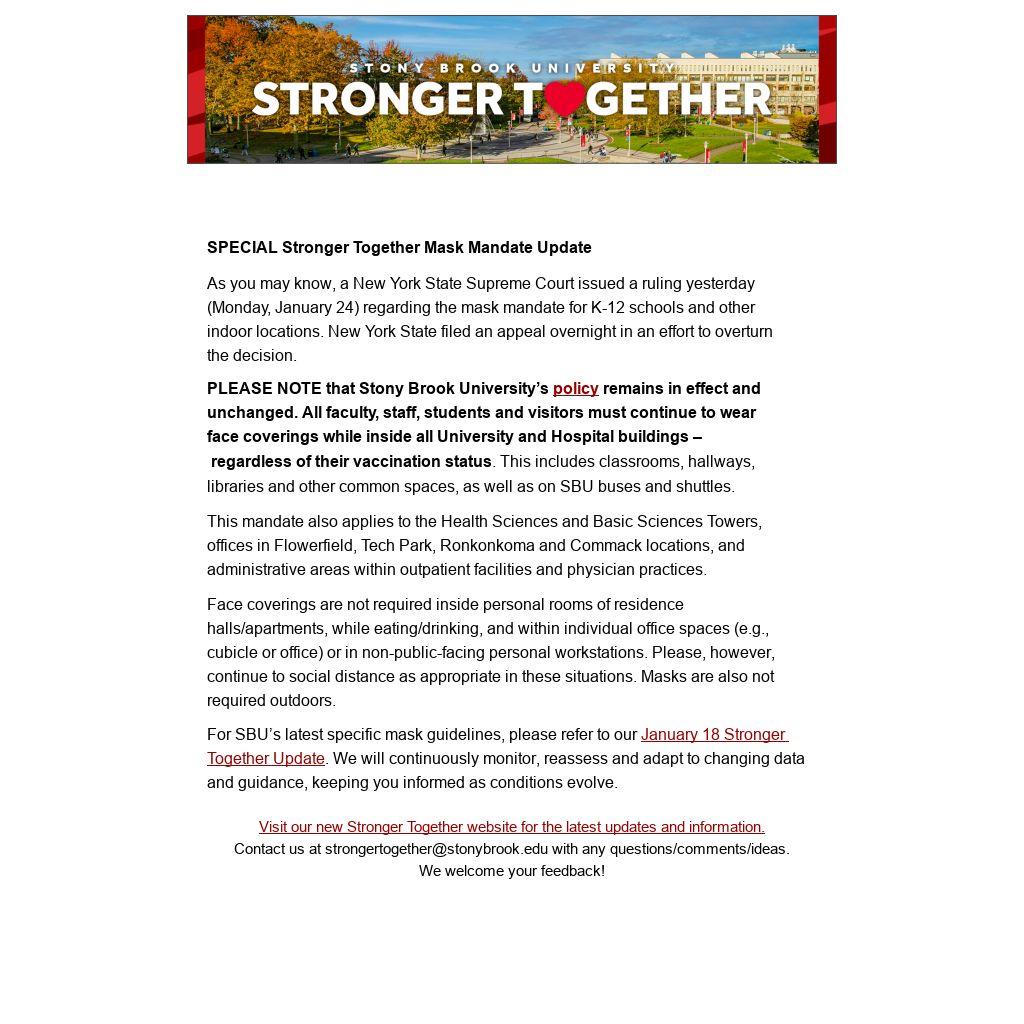 For SBU’s latest specific mask guidelines, please refer to our January 18 Stronger Together Update. We will continuously monitor, reassess and adapt to changing data and guidance, keeping you informed as conditions evolve.