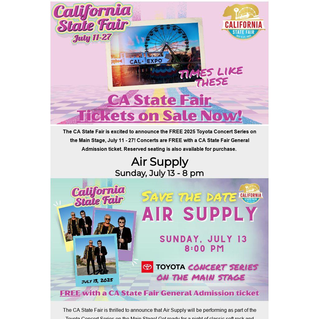 The CA State Fair is thrilled to announce that Air Supply will be performing as part of the Toyota Concert Series on the Main Stage! Get ready for a night of classic soft rock and unforgettable harmonies on Sunday, July 13. The concert is free with General Admission to the fair, which runs from July 11 to 27. Don't miss out on this incredible performance.