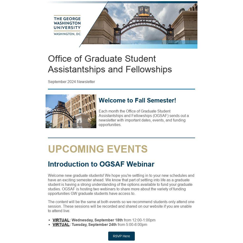 Each month the Office of Graduate Student Assistantships and Fellowships (OGSAF) sends out a newsletter with important dates, events, and funding opportunities.