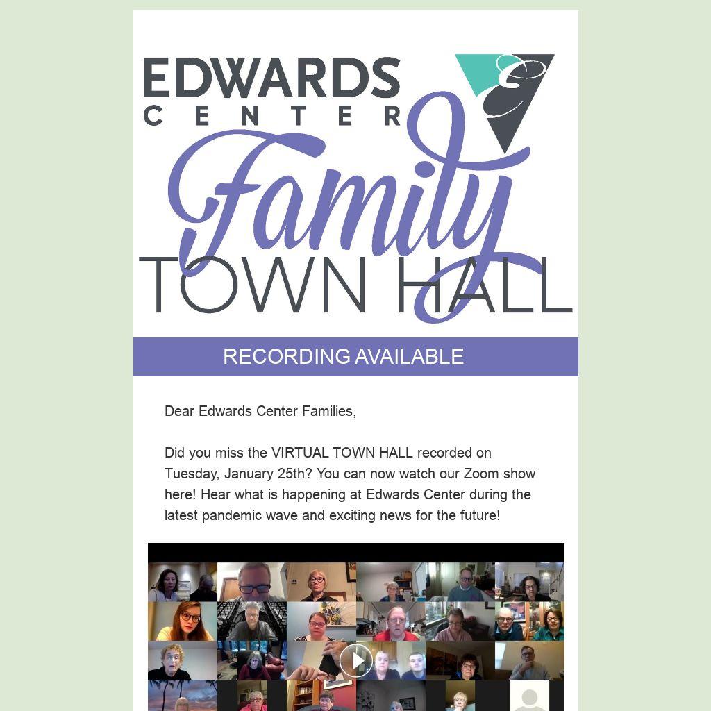 Did you miss the VIRTUAL TOWN HALL recorded on Tuesday, January 25th? You can now watch our Zoom show here! Hear what is happening at Edwards Center during the latest pandemic wave and exciting news for the future!