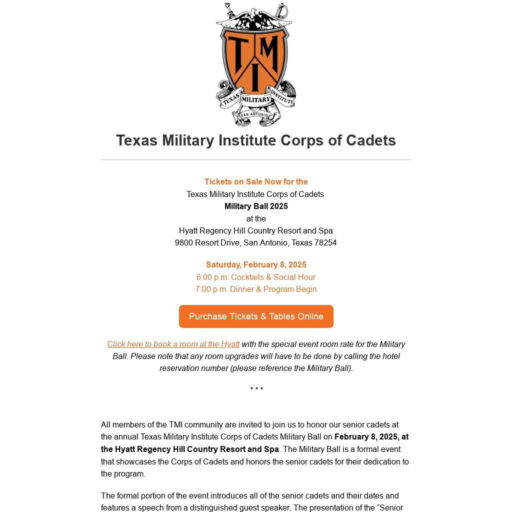 All members of the TMI community are invited to join us to honor our senior cadets at the annual Texas Military Institute Corps of Cadets Military Ball on February 8, 2025, at the Hyatt Regency Hill Country Resort and Spa. The Military Ball is a formal event that showcases the Corps of Cadets and honors the senior cadets for their dedication to the program.