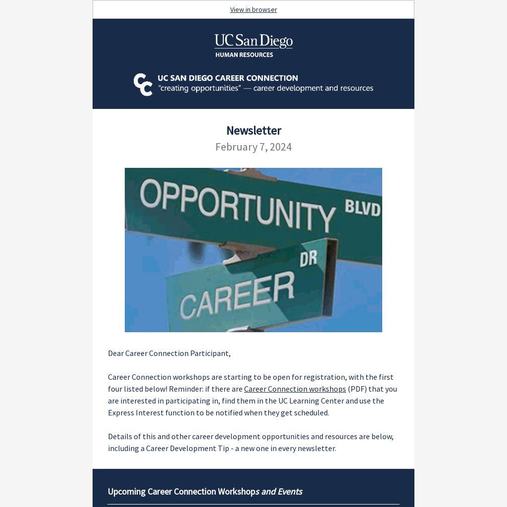 Career Connection is a free, comprehensive career development program for UC San Diego staff. It provides information and tools to assist you in achieving greater job satisfaction, current job enhancement, and lateral or upward career mobility. All UC San Diego staff employees, retirees and individuals on lay-off status are eligible to join Career Connection.