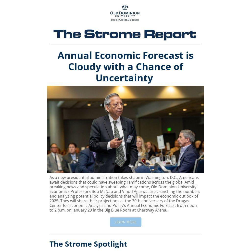 As a new presidential administration takes shape in Washington, D.C., Americans await decisions that could have sweeping ramifications across the globe. Amid breaking news and speculation about what may come, Old Dominion University Economics Professors Bob McNab and Vinod Agarwal are crunching the numbers and analyzing potential policy decisions that will impact the economic outlook of 2025. They will share their projections at the 30th anniversary of the Dragas Center for Economic Analysis and Policy’s Annual Economic Forecast from noon to 2 p.m. on January 29 in the Big Blue Room at Chartway Arena.