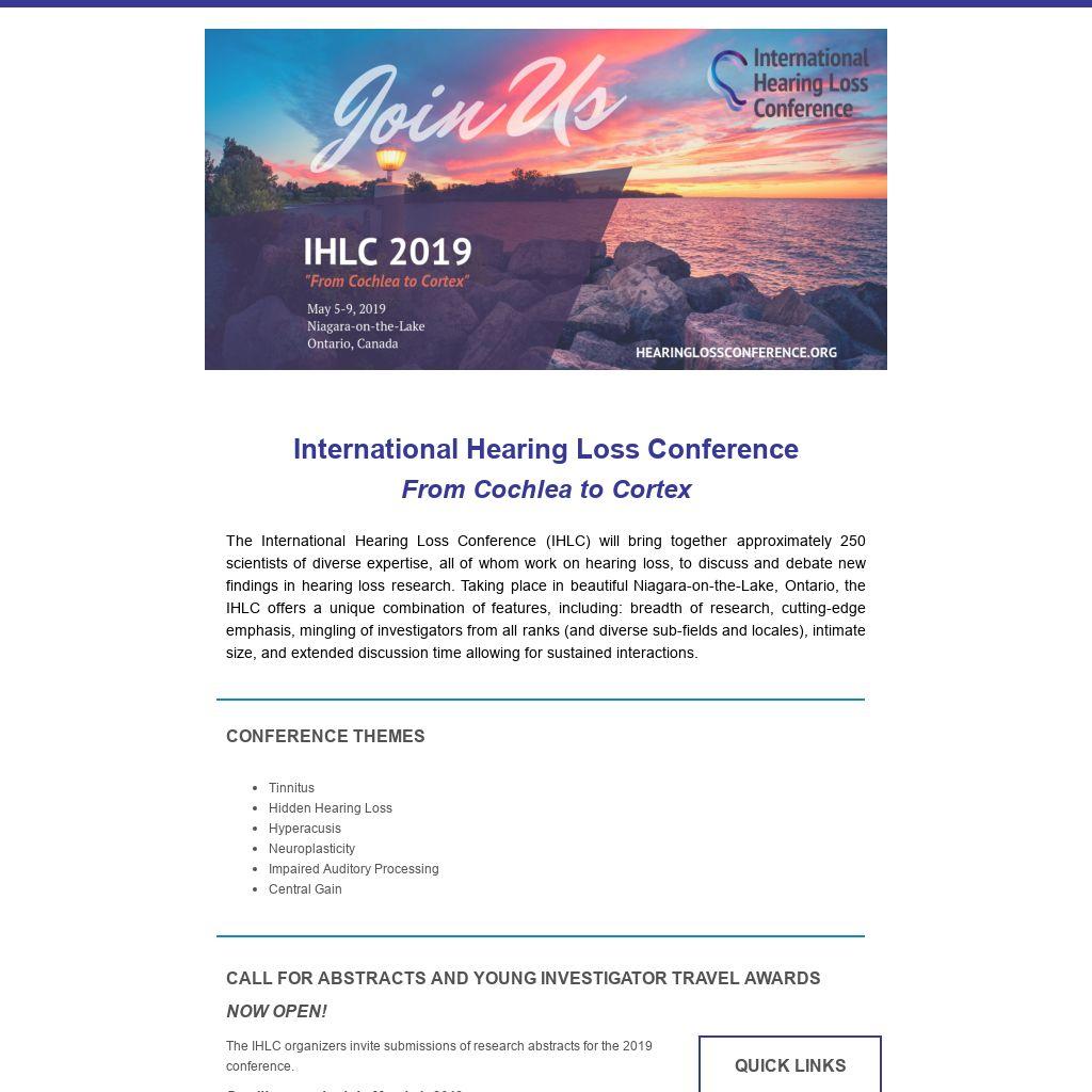 | The International Hearing Loss Conference (IHLC) will bring together approximately 250 scientists of diverse expertise, all of whom work on hearing loss, to discuss and debate new findings in hearing loss research. Taking place in beautiful Niagara-on-the-Lake, Ontario, the IHLC offers a unique combination of features, including: breadth of research, cutting-edge emphasis, mingling of investigators from all ranks (and diverse sub-fields and locales), intimate size, and extended discussion time allowing for sustained interactions.