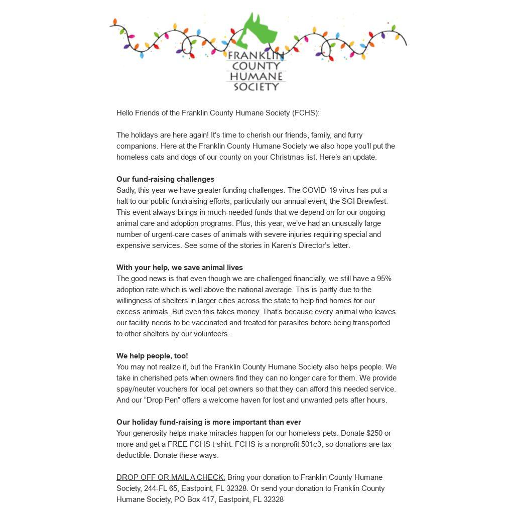 It takes a village to find homes for the unwanted pets in Franklin County. Besides our wonderful local adopters and fosters, we also partner with like-minded organizations such as Tampa Bay SPCA, Pinellas Humane Society, Smitten with Kittens, TARAA, and Big Dog Rescue that help take in our overflow of cats and dogs. As many of you know, we are a small nonprofit in a rural area that can't begin to absorb all the animals that come through our doors.