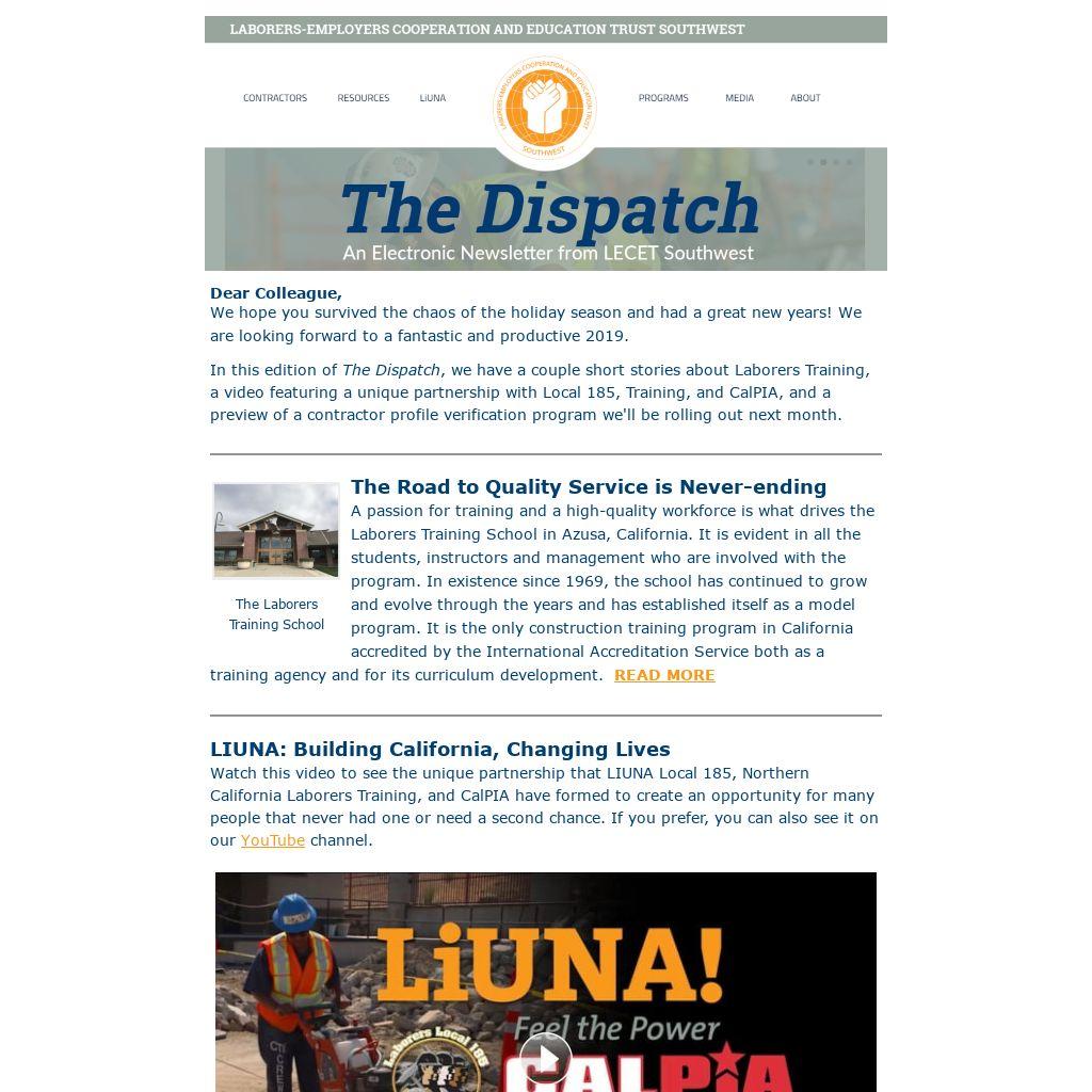 In this edition of The Dispatch, we have a couple short stories about Laborers Training, a video featuring a unique partnership with Local 185, Training, and CalPIA, and a preview of a contractor profile verification program we'll be rolling out next month.