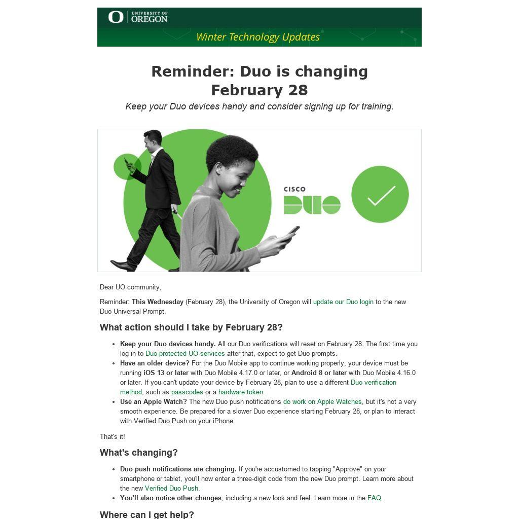 Keep your Duo devices handy. All our Duo verifications will reset on February 28. The first time you log in to Duo-protected UO services after that, expect to get Duo prompts.