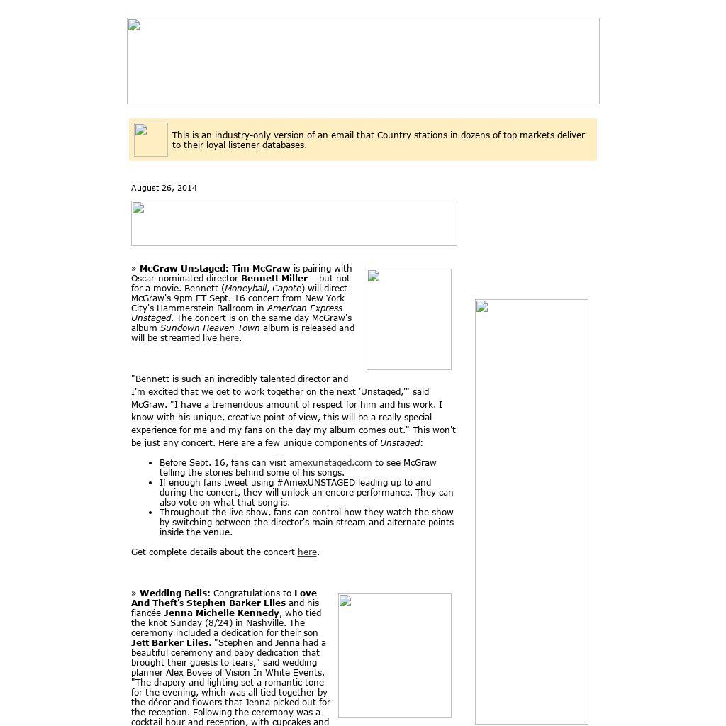 Birthdays Tuesday (8/26): Brian Kelley (Florida Georgia Line), Jimmy Olander (Diamond Rio), Don Bowman. Wednesday (8/27): Jeff Cook (Alabama), Colt Ford, Jeffrey Steele, J.D. Crowe, the late Jimmy C. Newman, the late Carter Stanley. Thursday (8/28): Shania Twain, Jake Owen, LeAnn Rimes, Cassadee Pope, Sherrié Austin. On TV Tuesday (8/26): Martina McBride, Tavis Smiley (PBS repeat). Wednesday (8/27): Hunter Hayes, The Ellen Degeneres Show (syndicated repeat); Kacey Musgraves, The Tonight Show Starring Jimmy Fallon (NBC repeat). Thursday (8/28): Dan + Shay, The Ellen Degeneres Show (syndicated repeat); Florida Georgia Line, The Tonight Show Starring Jimmy Fallon (NBC repeat); Chase Rice, Late Night With Seth Myers (NBC repeat). Upcoming Album Releases Aug. 25 Brad Paisley Moonshine In The Trunk (Arista) Leading off with the single "River Bank," Paisley co-produced the album with Luke Wooten and wrote 13 of the 14 songs. Aug. 26 Brushville Self-Titled, (Brushville) This Illinois-based band recorded their album with legendary producer Kyle Lehning (Randy Travis) and the debut single is "Baby's Got Her Boots On." Lenny Cooper The Grind (BackRoad/Average Joes) The "Mud-Digger King" returns with his third studio album, featuring guests including Colt Ford, Bucky Covington and Bubba Sparxxx. Sept. 2 Terri Clark Some Songs Various Dear Jean: Artists Celebrate The Music Of Jean Ritchie Sept. 8 Alabama Angels Among Us: Hymns & Gospel Favorites Sep. 9 Lee Brice I Don't Dance Dustin Lynch Where It's At Brothers Osborne Self-Titled Sept. 16 Tim McGraw Sundown Heaven Town George Strait The Cowboy Rides Away: Live From AT&T Stadium Sept. 23 Kenny Chesney The Big Revival Lee Ann Womack The Way I'm Livin' Big & Rich Gravity Sept. 30 Lady Antebellum 747 Blake Shelton Bringing Back The Sunshine Marty Stuart Saturday Night & Sunday Morning Ricky Skaggs and Sharon White Hearts Like Ours |