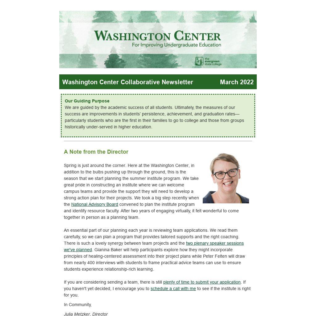 Spring is just around the corner. Here at the Washington Center, in addition to the bulbs pushing up through the ground, this is the season that we start planning the summer institute program. We take great pride in constructing an institute where we can welcome campus teams and provide the support they will need to develop a strong action plan for their projects. We took a big step recently when the