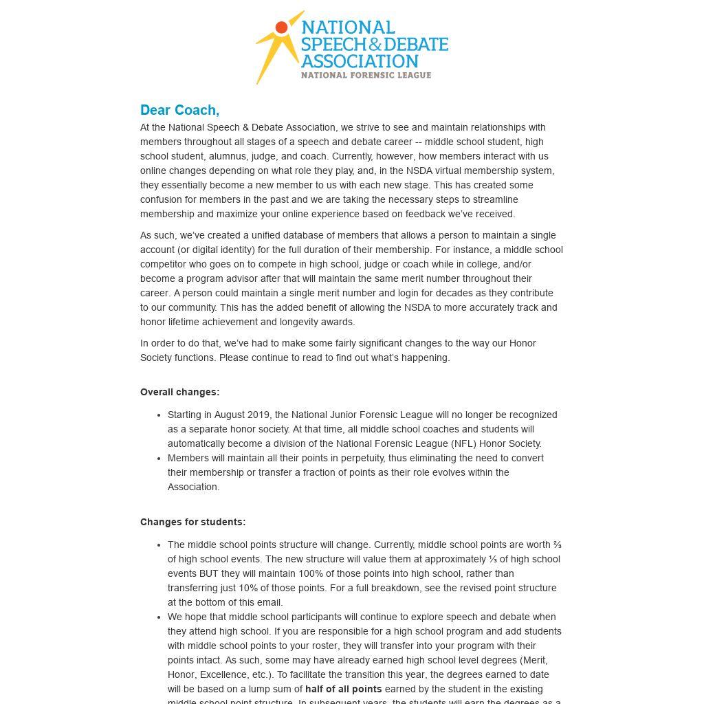 Dear Coach, At the National Speech & Debate Association, we strive to see and maintain relationships with members throughout all stages of a speech and debate career -- middle school student, high school student, alumnus, judge, and coach. Currently, however, how members interact with us online changes depending on what role they play, and, in the NSDA virtual membership system, they essentially become a new member to us with each new stage. This has created some confusion for members in the past and we are taking the necessary steps to streamline membership and maximize your online experience based on feedback we’ve received.