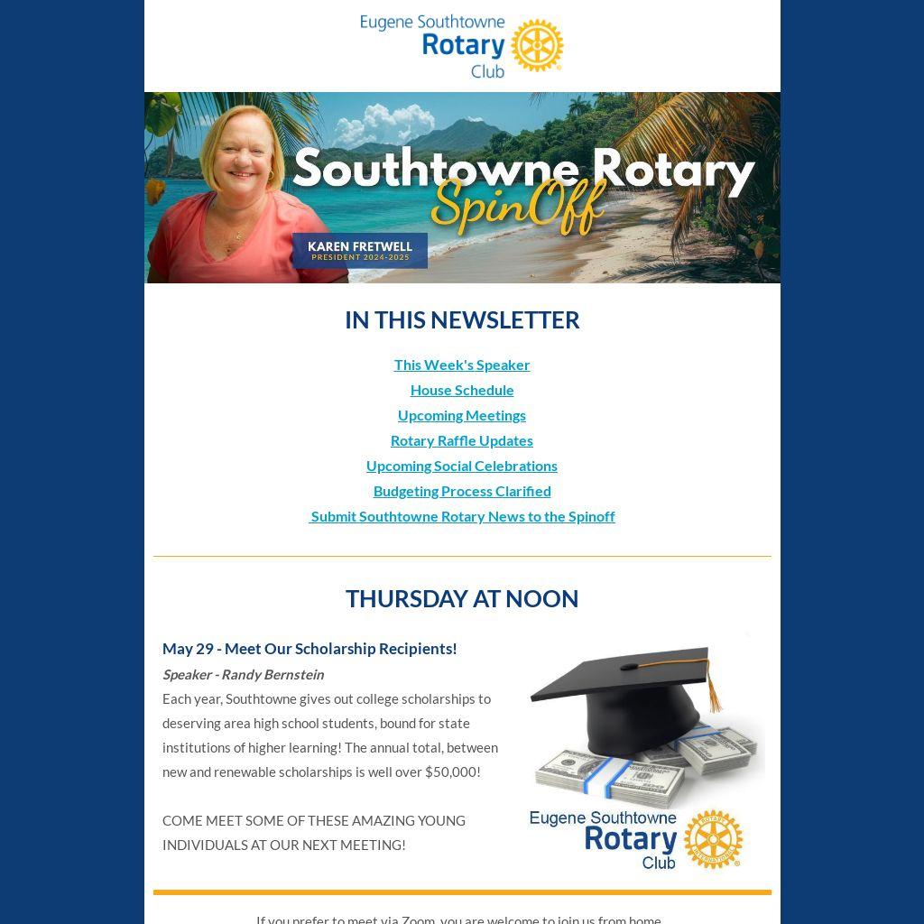 Have news to share in the Spinoff? Please have it submitted by Tuesday afternoon or it may not be in that week's edition. Email your news and pictures to: contact@southtownerotary.org.