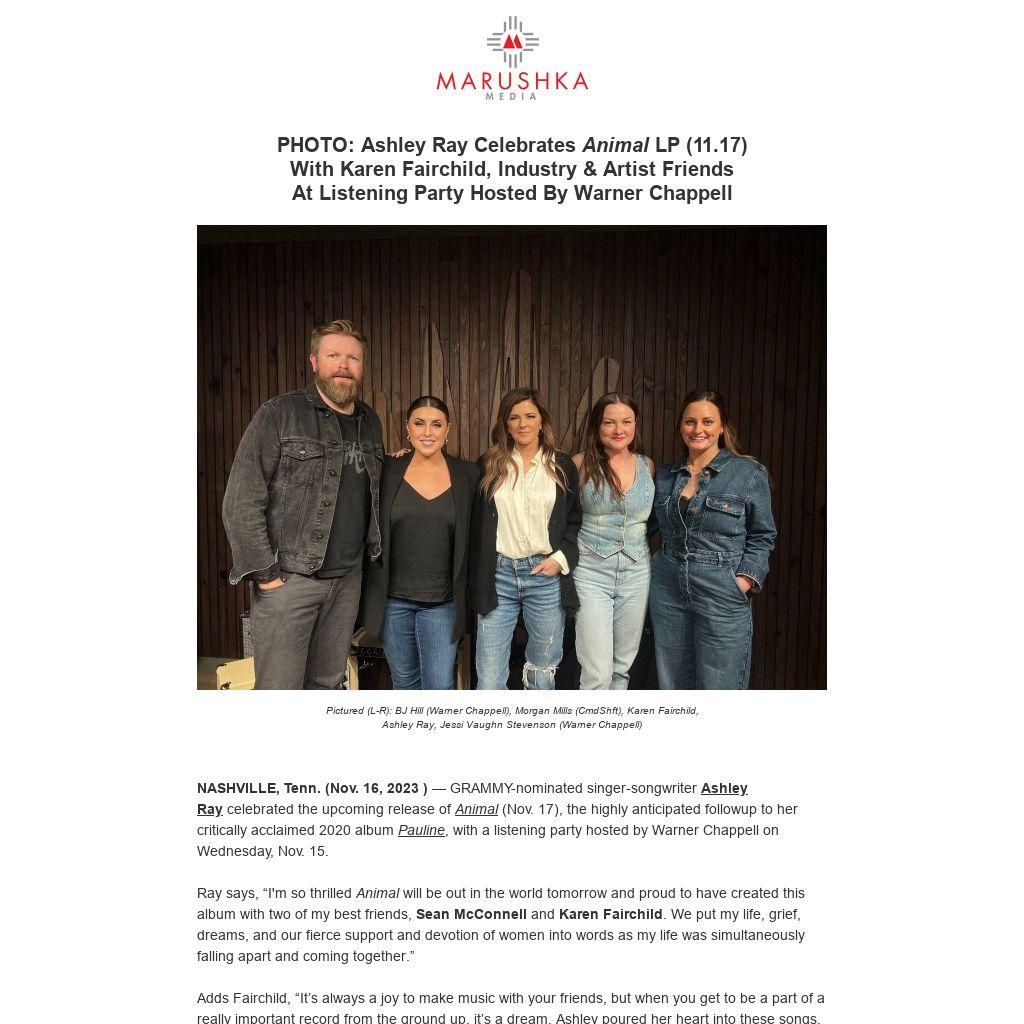 | NASHVILLE, Tenn. (Nov. 16, 2023 ) — GRAMMY-nominated singer-songwriter Ashley Ray celebrated the upcoming release of Animal (Nov. 17), the highly anticipated followup to her critically acclaimed 2020 album Pauline, with a listening party hosted by Warner Chappell on Wednesday, Nov. 15.