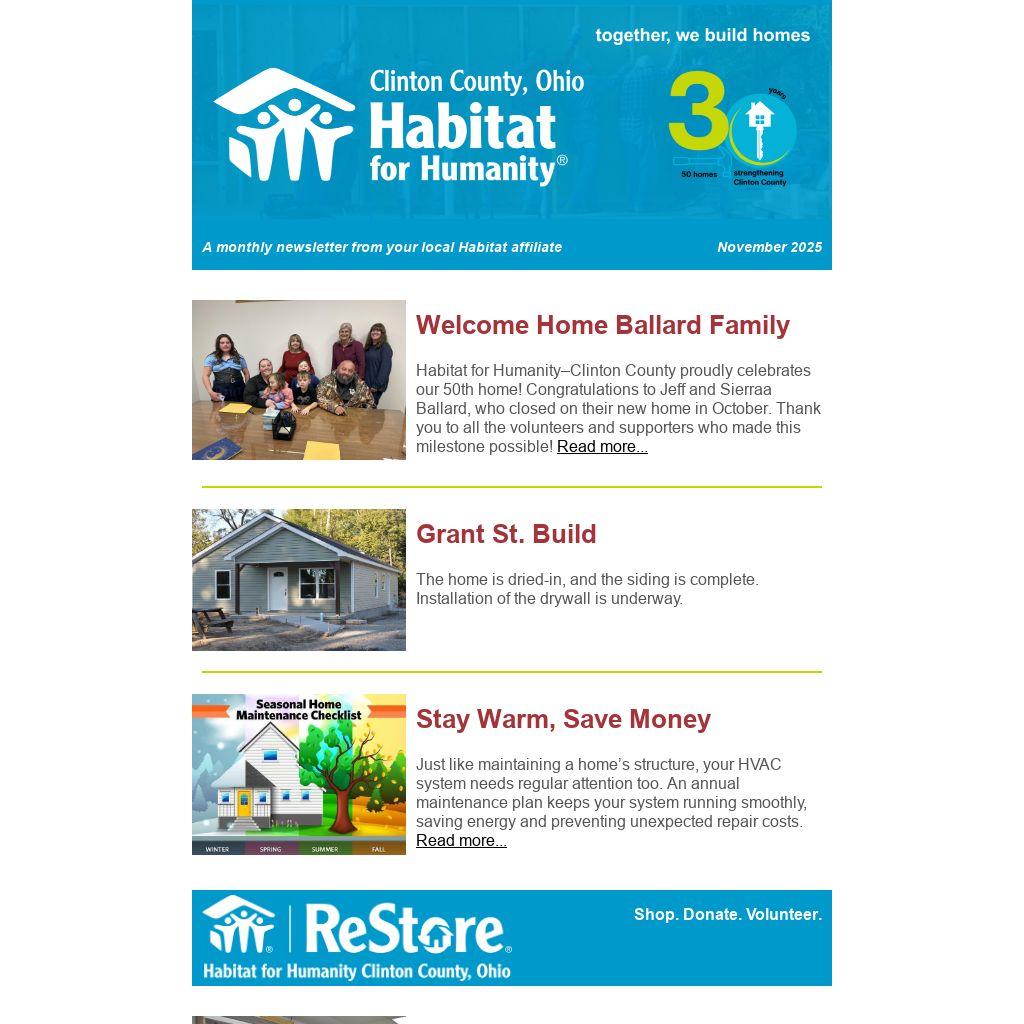 Habitat for Humanity–Clinton County proudly celebrates our 50th home! Congratulations to Jeff and Sierraa Ballard, who closed on their new home in October. Thank you to all the volunteers and supporters who made this milestone possible! Read more...