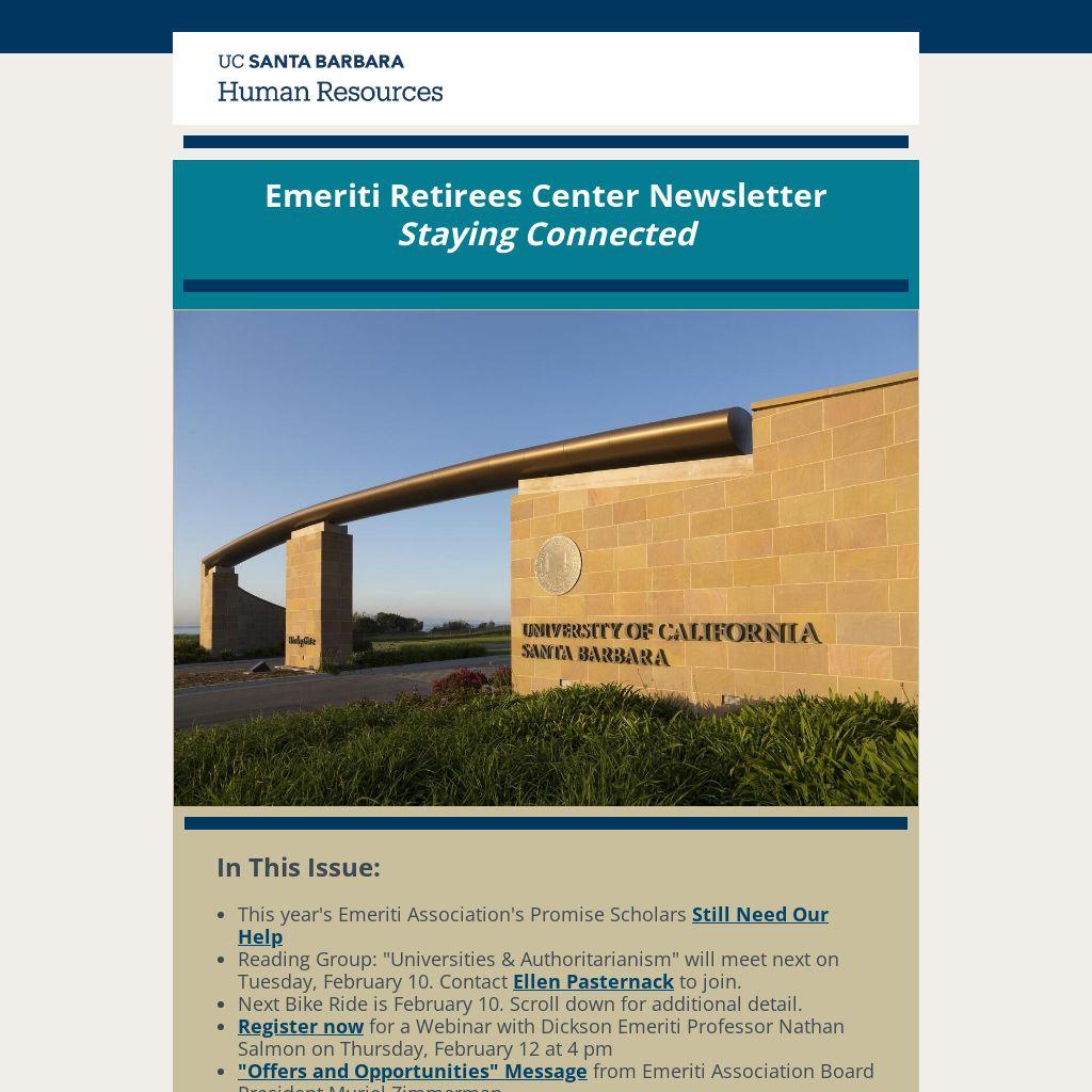 The Emeriti Association announces the next meeting of a new reading group for emeriti and retirees to discuss two articles each month on how authoritarian regimes globally have attempted to control universities and how universities, their faculties, and students respond. The next meeting is scheduled for Tuesday, February 10, from 4 - 5 pm on Zoom. We will be discussing two chapters, one by Ruth Ben-Ghiat describing the means by which Italian universities were brought under fascist ideological control, and the other by John Connelly describing how Polish universities were able to maintain a degree of independence and integrity under state socialism. Discussion questions inviting comparisons to our current situation will be distributed ahead of time. Convener of the reading group is Board member Chuck Bazerman, bazerman@ucsb.edu. Register by contacting Ellen Pasternack, epasternack@ucsb.edu. You will receive a link to the month's readings with confirmation of your attendance.