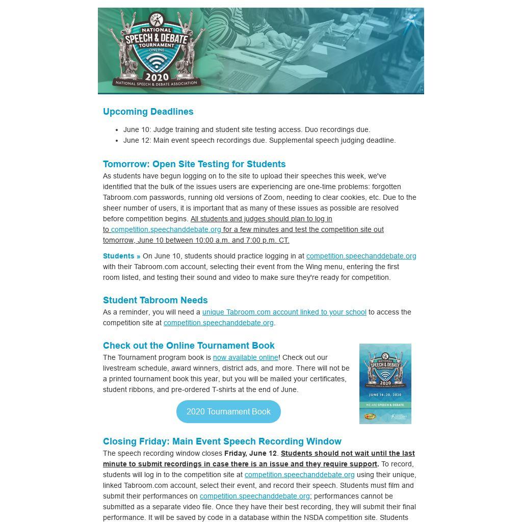 - June 12: Main event speech recordings due. Supplemental speech judging deadline.