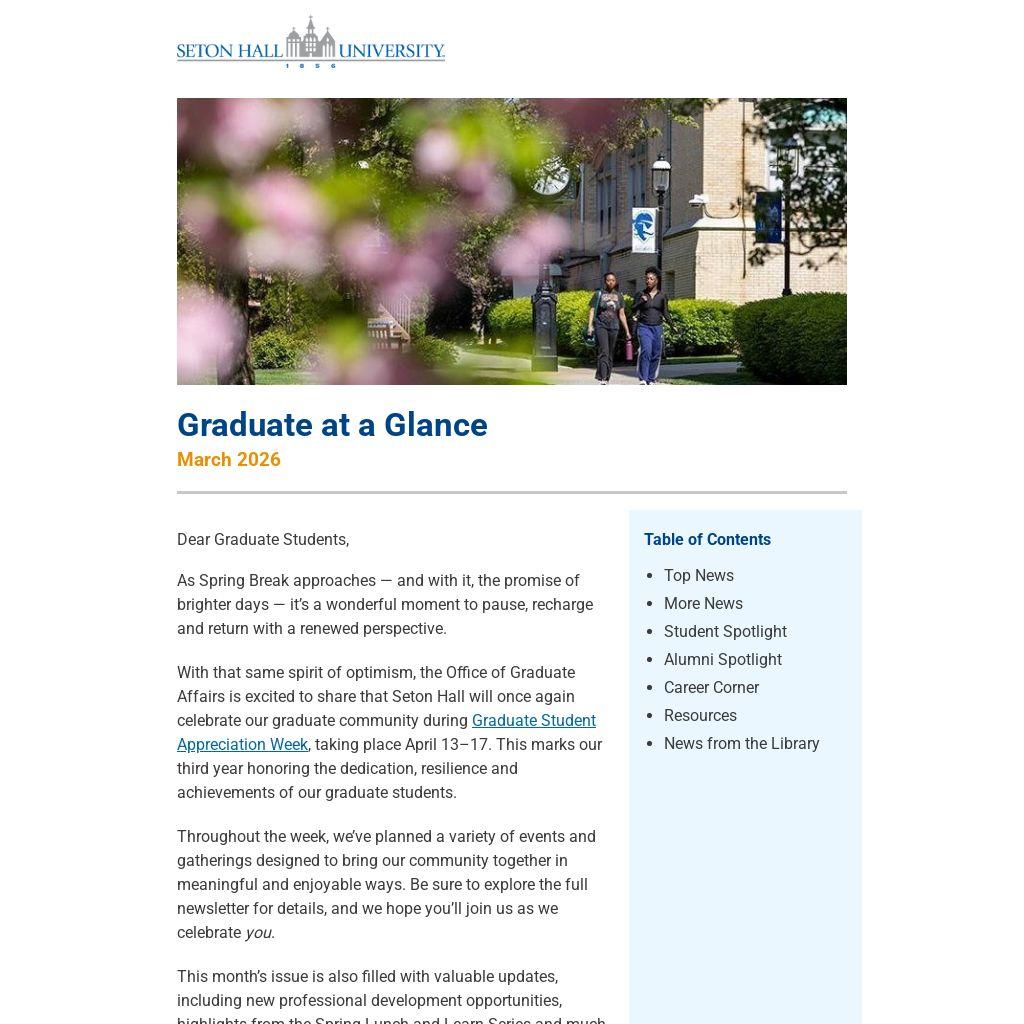With that same spirit of optimism, the Office of Graduate Affairs is excited to share that Seton Hall will once again celebrate our graduate community during Graduate Student Appreciation Week, taking place April 13–17. This marks our third year honoring the dedication, resilience and achievements of our graduate students.
