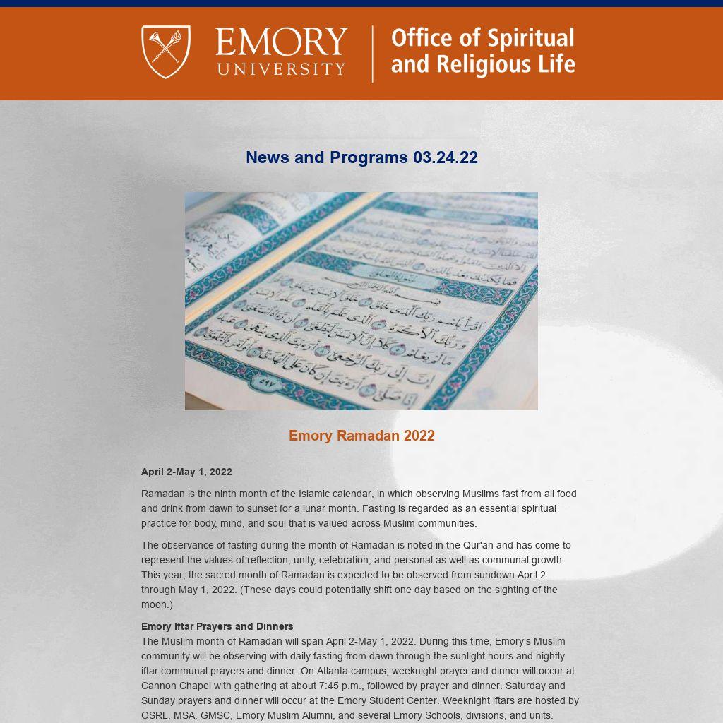 Emory OSRL ENews is published weekly during term by the Emory University Office of Spiritual and Religious Life publicizing Atlanta-campus spiritual life programs. It is not a comprehensive listing. For Oxford College spiritual life, please click here. To submit information or to update your preferences, please contact religiouslife@emory.edu.