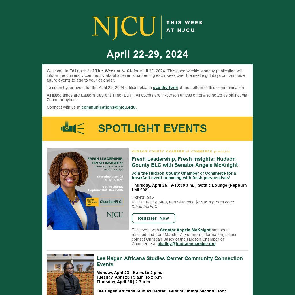 Welcome to Edition 112 of This Week at NJCU for April 22, 2024. This once-weekly Monday publication will inform the university community about all events happening each week over the next eight days on campus + future events to add to your calendar.