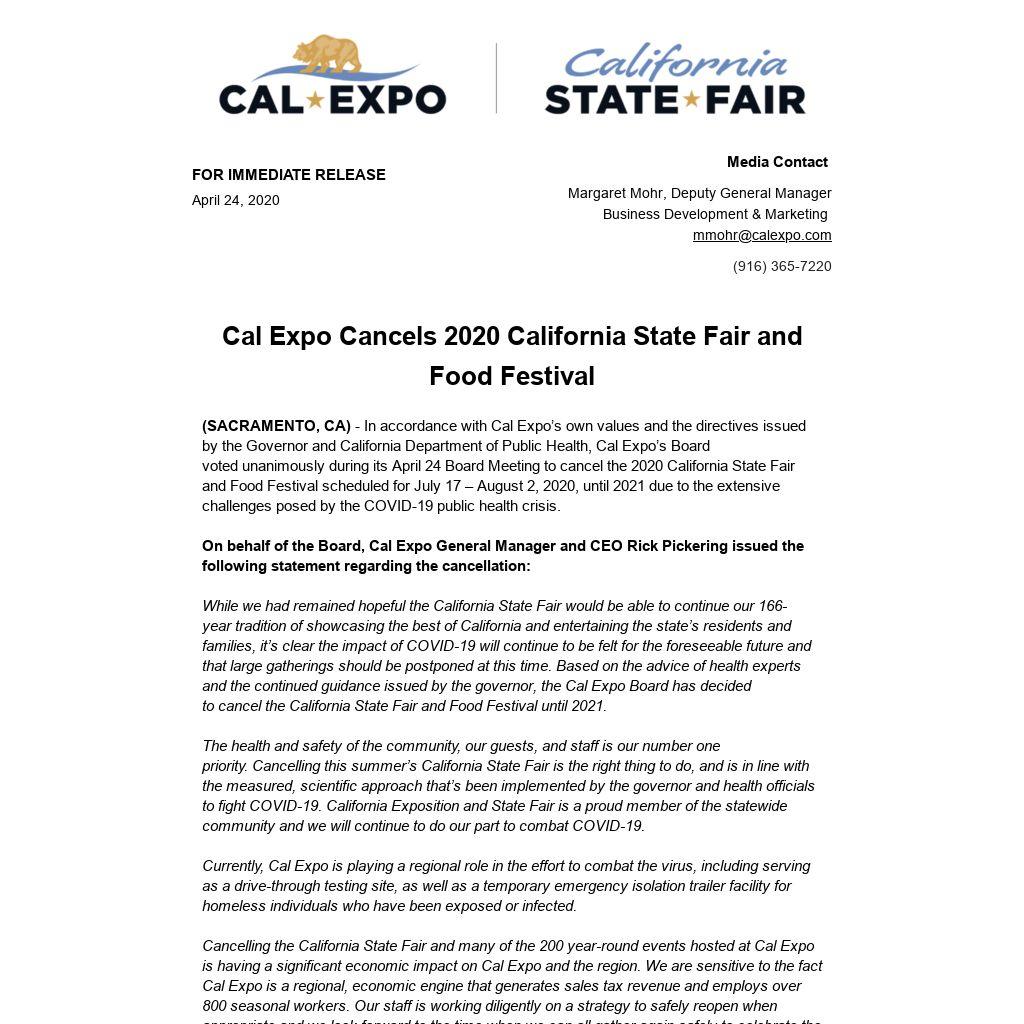 | (SACRAMENTO, CA) - In accordance with Cal Expo’s own values and the directives issued by the Governor and California Department of Public Health, Cal Expo’s Board voted unanimously during its April 24 Board Meeting to cancel the 2020 California State Fair and Food Festival scheduled for July 17 – August 2, 2020, until 2021 due to the extensive challenges posed by the COVID-19 public health crisis.