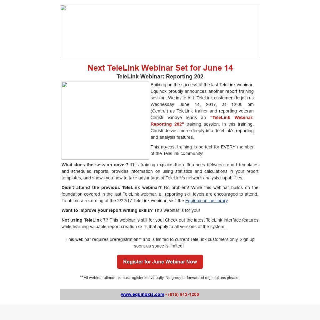 Building on the success of the last TeleLink webinar, Equinox proudly announces another report training session. We invite ALL TeleLink customers to join us Wednesday, June 14, 2017, at 12:00 pm (Central) as TeleLink trainer and reporting veteran Christi Vanoye leads an "TeleLink Webinar: Reporting 202" training session. In this training, Christi delves more deeply into TeleLink's reporting and analysis features.