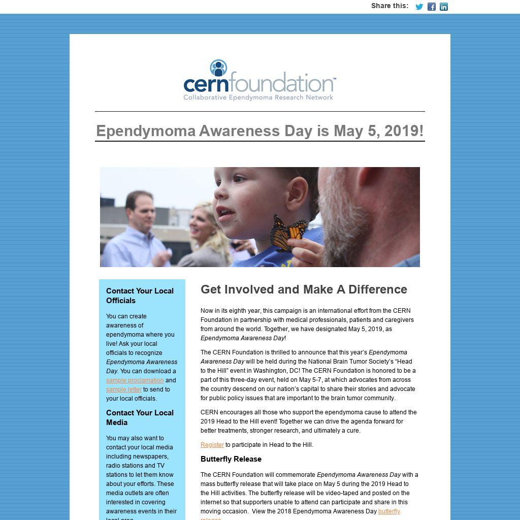Now in its eighth year, this campaign is an international effort from the CERN Foundation in partnership with medical professionals, patients and caregivers from around the world. Together, we have designated May 5, 2019, as Ependymoma Awareness Day!