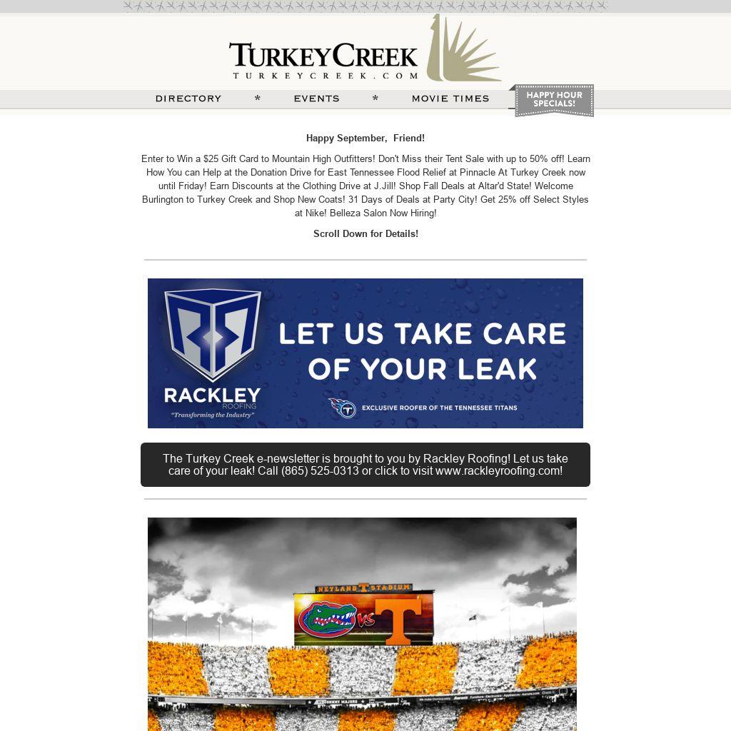 Enter to Win a $25 Gift Card to Mountain High Outfitters! Don't Miss their Tent Sale with up to 50% off! Learn How You can Help at the Donation Drive for East Tennessee Flood Relief at Pinnacle At Turkey Creek now until Friday! Earn Discounts at the Clothing Drive at J.Jill! Shop Fall Deals at Altar'd State! Welcome Burlington to Turkey Creek and Shop New Coats! 31 Days of Deals at Party City! Get 25% off Select Styles at Nike! Belleza Salon Now Hiring!