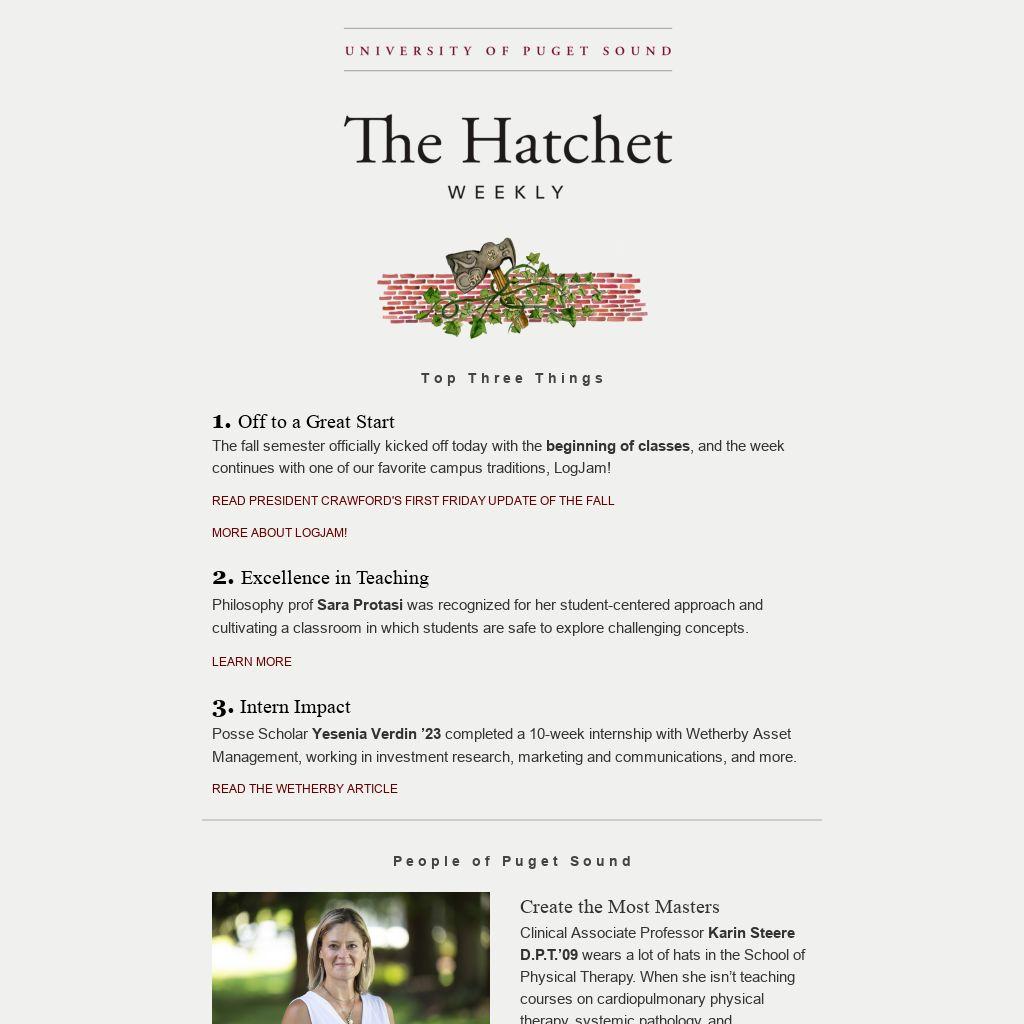 Play It Again, Sam “We are always moving forward, with purpose and intention, to become the university of the future, and to firmly establish Puget Sound among the finest institutions in the country,” said President Isiaah Crawford in the Fall Faculty and Staff Welcome last week. Miss it? Read the transcript online.